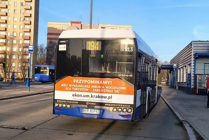 Na ulicach miasta pojawiły się autobusy z ważnym komunikatem skierowanym do przedsiębiorców oferujących noclegi dla turystów. Hasło kampanii brzmi: „Przypominamy! Jeśli wynajmujesz miejsca noclegowe dla turystów – zarejestruj się na ekon.um.krakow.pl.”